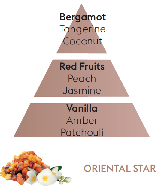 Sensual and enticing. It carries the sparkle of a first meeting, with its top notes of coconut and bergamot, the sensual vanilla-scented audacity of amber and patchouli and a tender and fruity heart with scents of red fruits and jasmine.