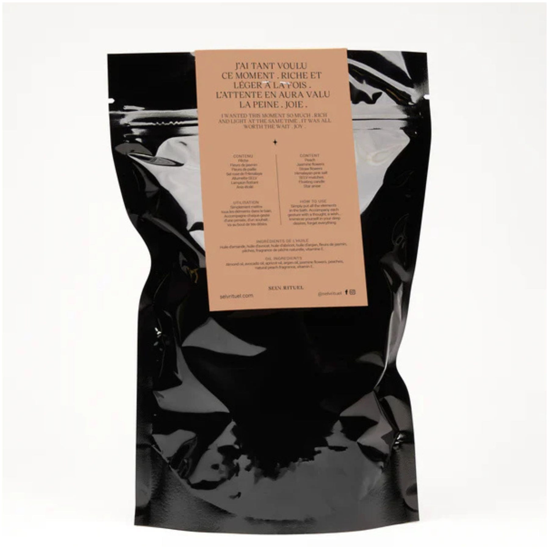 Himalayan pink salt, peaches, jasmine flowers, straw flowers, SELV matches, tealight, star anise, Rituel Luv bath and body oil (sweet almond oil, argan oil, avocado oil, apricot oil, natural peach fragrance and vitamin E).